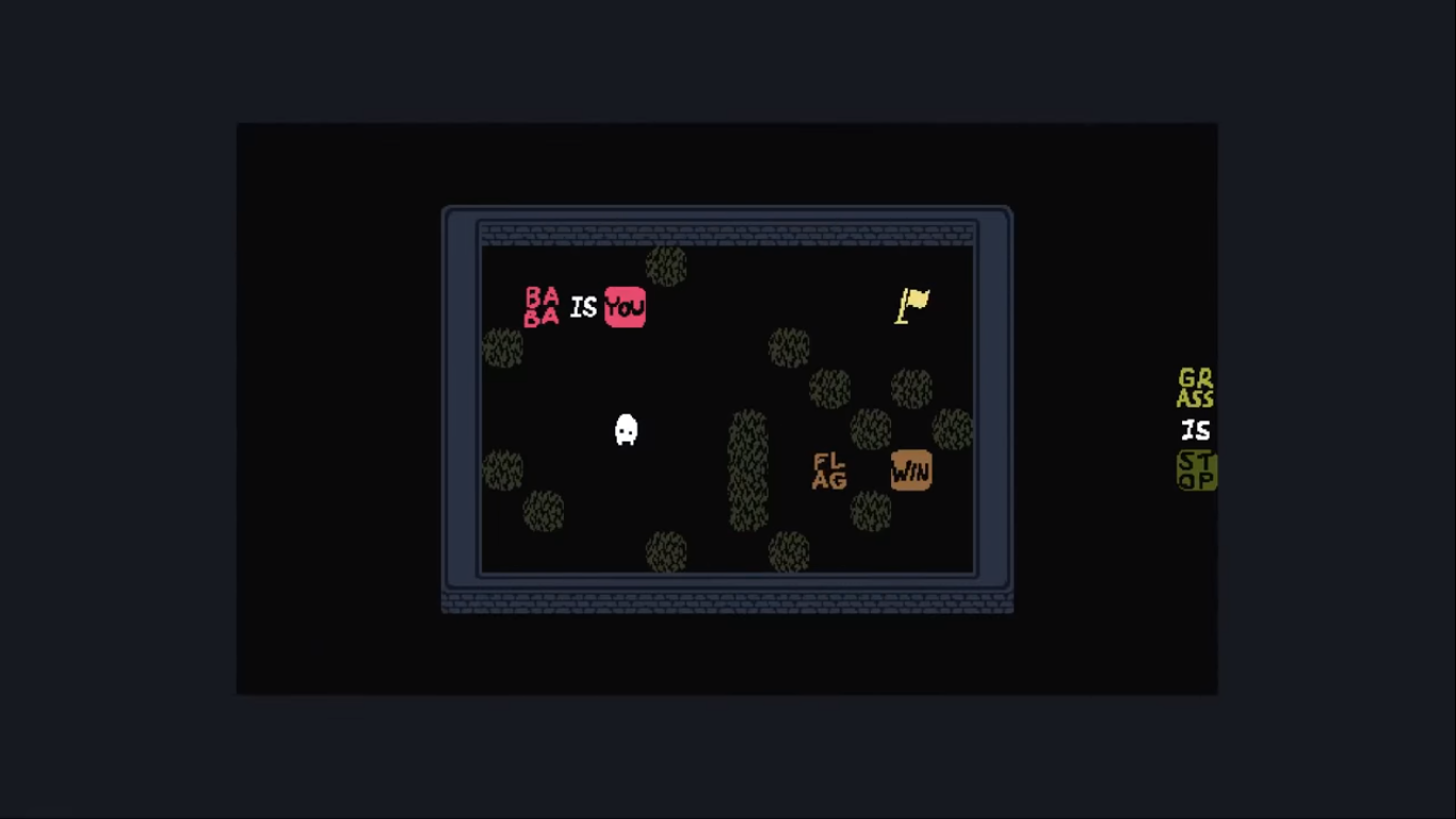 Now in this scenario all you have to do is push ‘Baba Is You’, ‘Flag’ and ‘Win’ outside the box and make an additional statement like ‘Flag Is Win’ by pushing ‘Flag’ above the ‘Is’ and ‘Win’ below to end the puzzle.